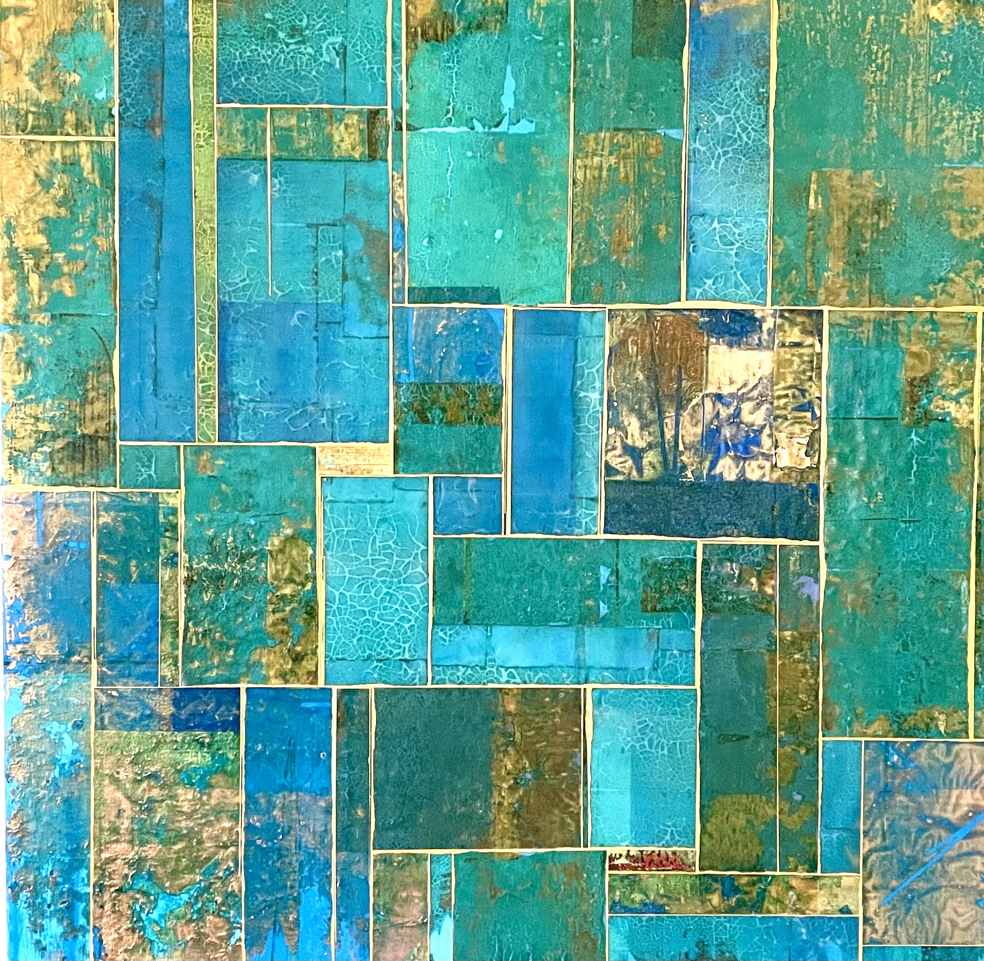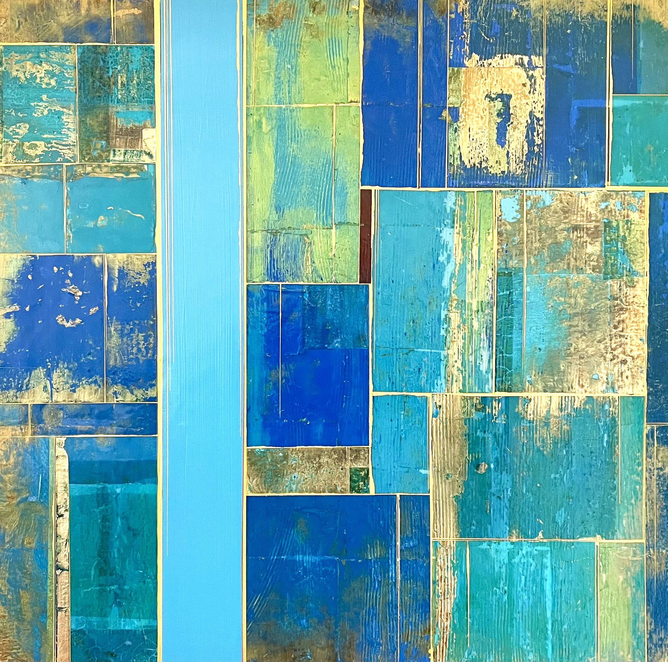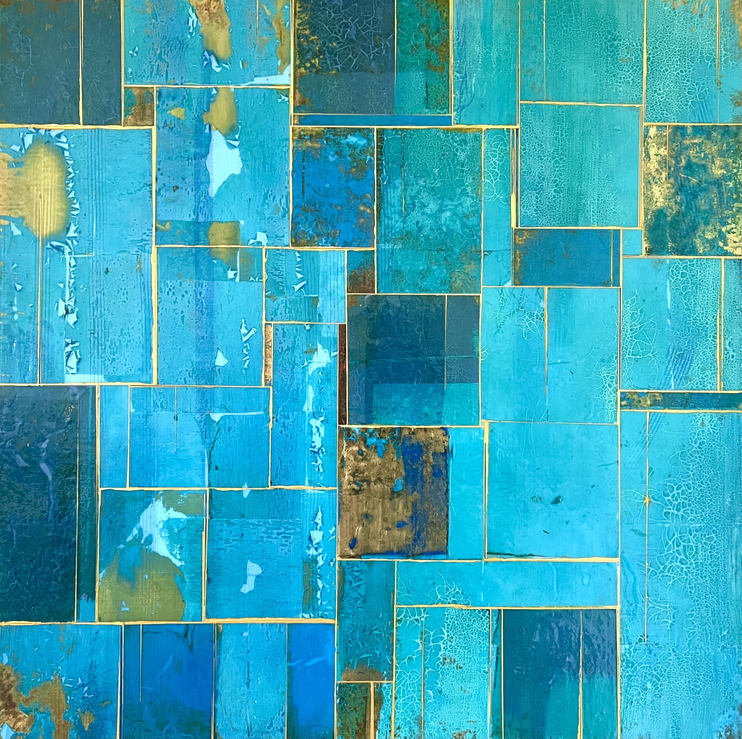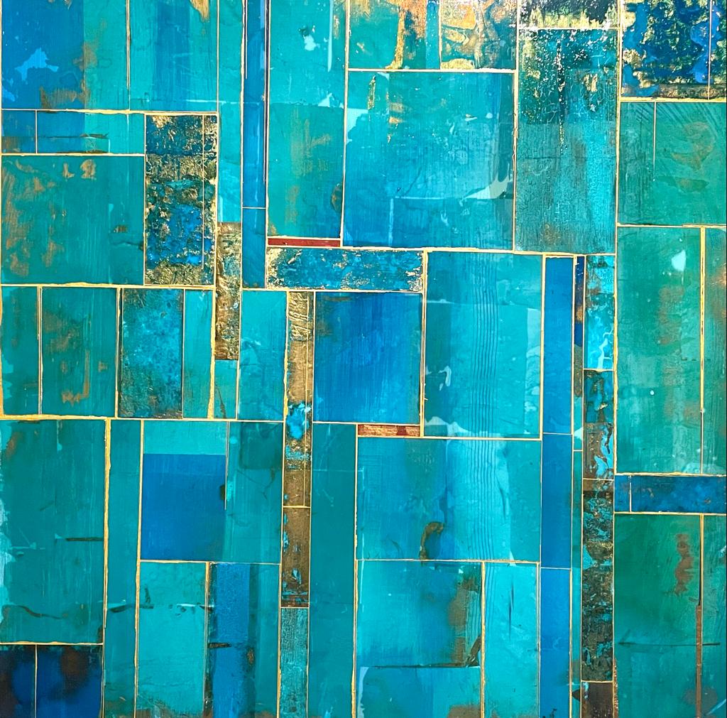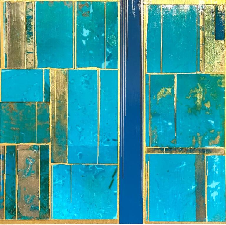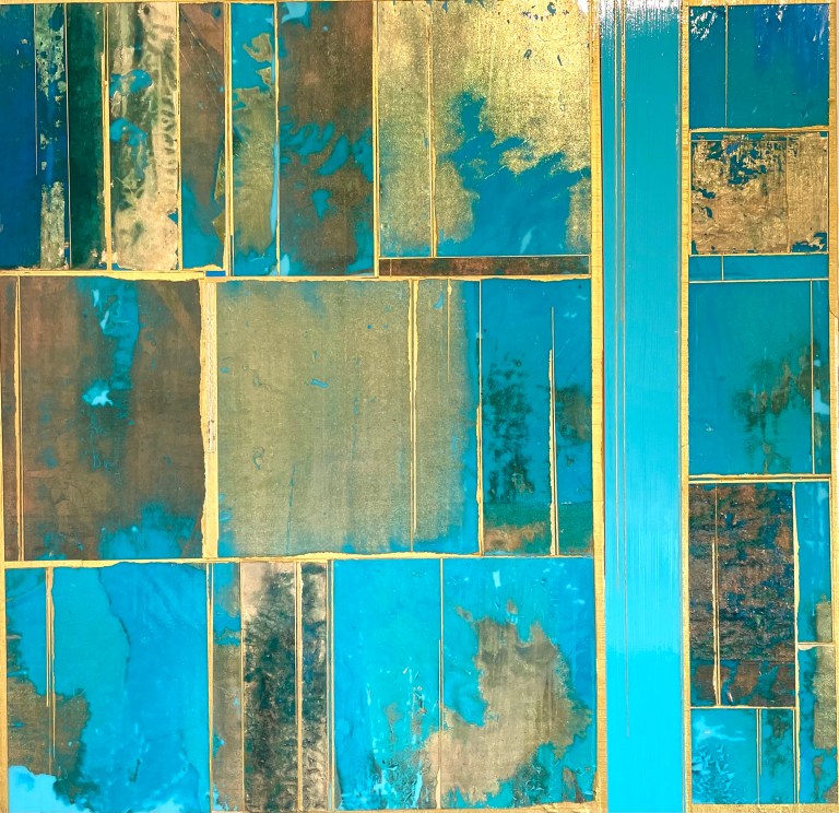 Glimpses No 9, 2021. 24×24”. Acrylics and metal leaf on panel.
