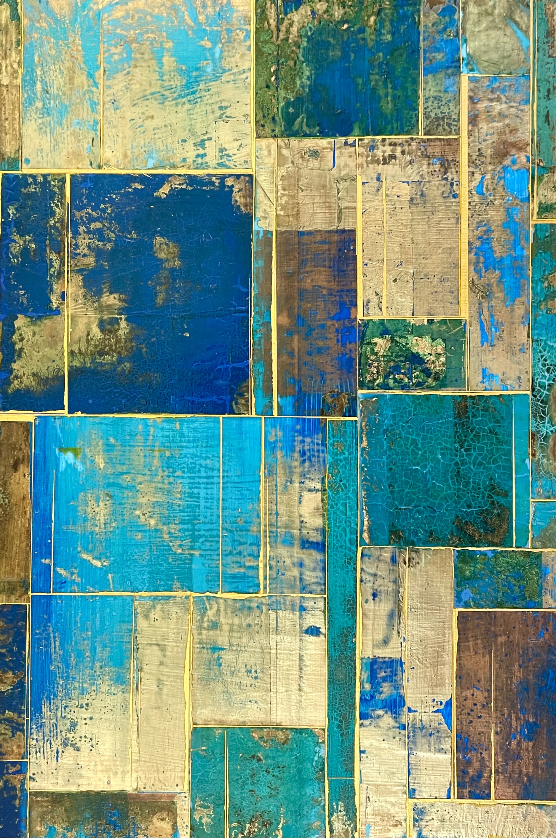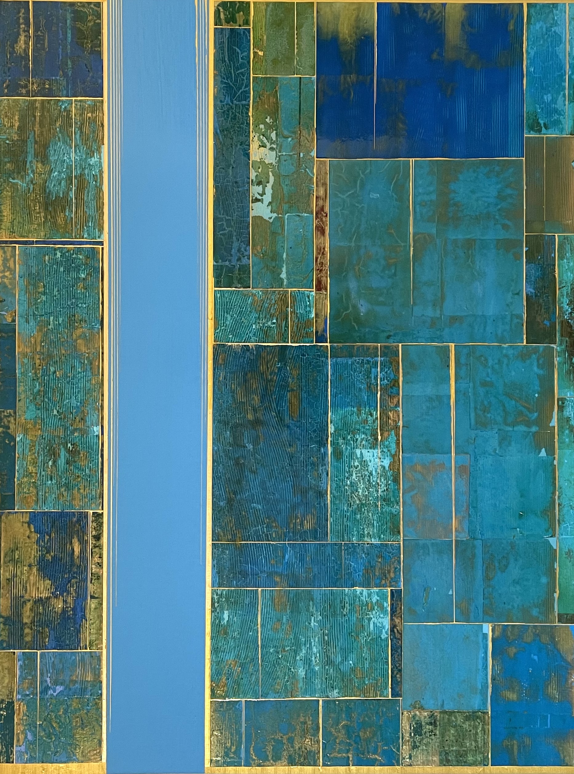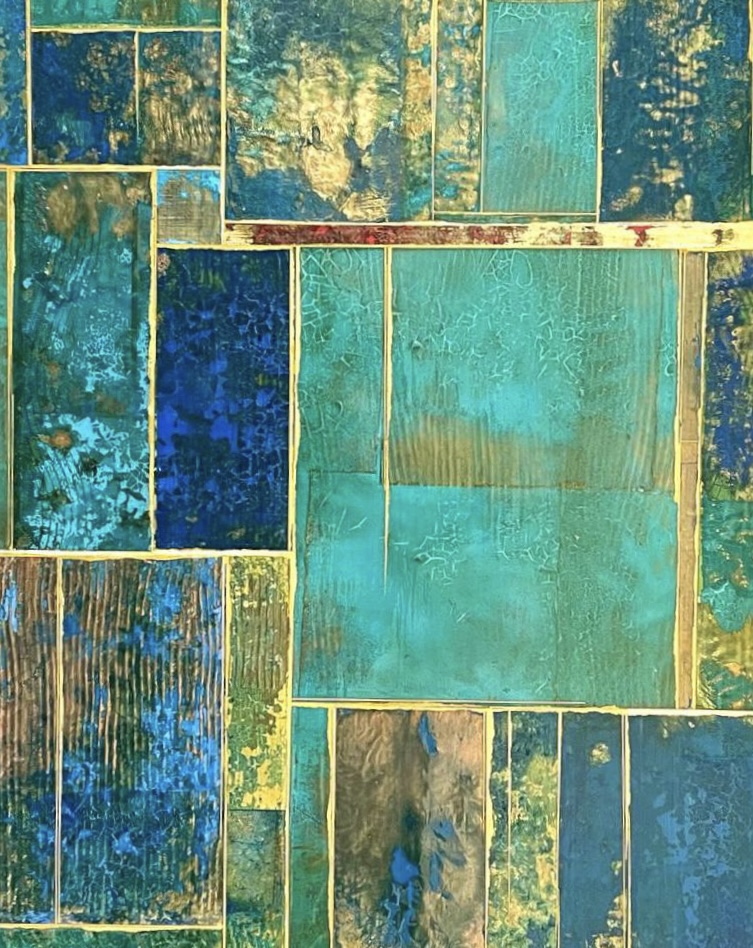 Glimpses No 10, 2021. 36×24”. Acrylics and metal leaf on panel.
